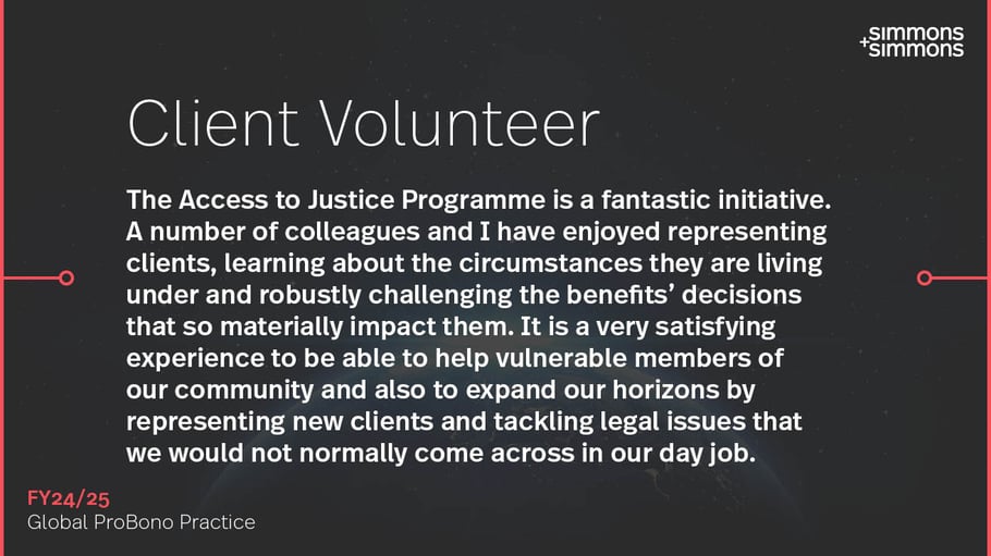 Rooted in the community, the programme takes cases directly from South West London Law Centre and other frontline disability services. Its success highlights the transformative impact of pro bono work and demonstrates how the expertise of corporate lawyers can be effectively harnessed to address pressing social justice issues.