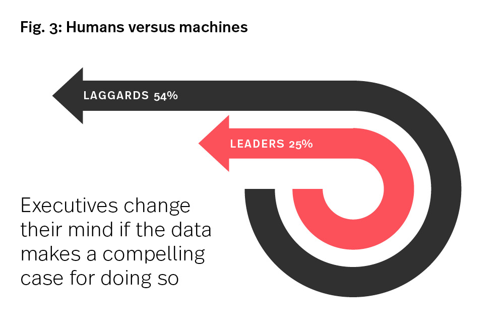 How much should executives rely on what the data shows? And what are the implications of blindly following the authority of an algorithm? These are big and novel questions. Executives are taking a cautious approach. They follow their human insight and are not unduly swayed by the data. This is particularly the case among data leaders. Executives at these organisations are less likely to change their minds if data makes a compelling case for doing so (Fig. 3). This could evidence healthy scrutiny of the data and application of experience. Equally, it could indicate that, as larger organisations, data leaders find it harder to change their agreed approach, even if the data suggests a different course of action. This could be a failing of corporate governance.