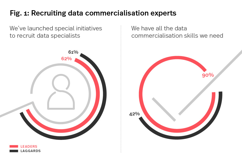 Data leaders and laggards are working hard to find data commercialisation experts. Both sides have launched targeted initiatives to find the right people. The difference is that data leaders are significantly more successful (Fig. 1). Data leaders are big players – with a typical turnover of £1bn. That means they’re in a strong position to offer more attractive financial packages and, importantly, the most interesting data challenges.