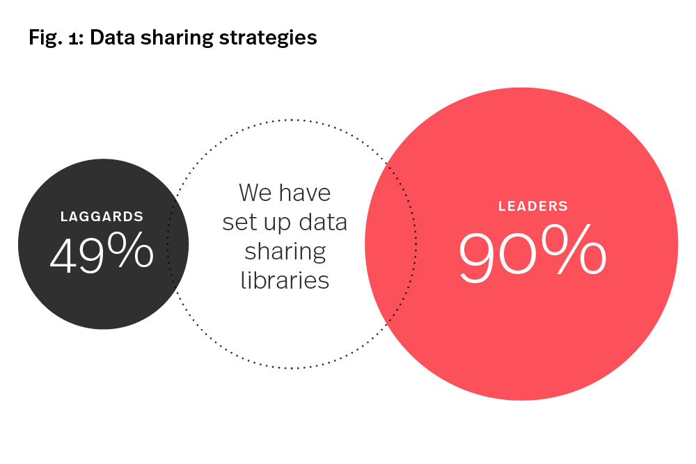 Teams across your organisation have different data needs. They also have different preferences for how they access data assets. Data leaders have been quick to meet this demand. Our research shows 66% adopt a flexible approach to sharing data insights across their organisation. A further 90% have set up data libraries to help employees understand the information that is available to them – nearly double the proportion of laggards (Fig. 1).