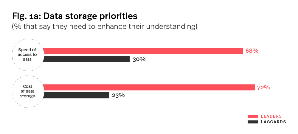 The market leaders of the future will be those that unearth data-driven insights the fastest. There’s no point in finding out that a customer is looking to buy a new smartphone several months after they began browsing or in displaying location-driven or personalised content a few minutes after the customer has left. Data leaders are racing to take pole position. Our research shows that 68% of data leaders prioritise the speed of data access when choosing data storage solutions (Fig. 1a). At the same time, they remain mindful of costs. To balance these sometimes-conflicting priorities, data leaders have turned their backs on on-premise solutions: 76% have now moved their data infrastructure to the cloud.