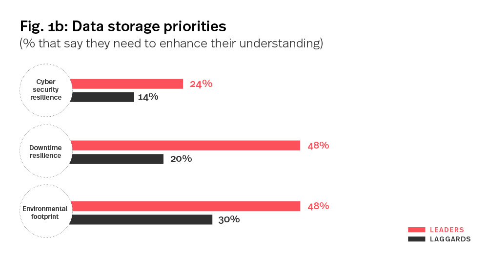 Data protection authorities have flexed their muscles by recently announcing major fines on the likes of British Airways and Marriott. A clear imperative now exists for companies to not only prevent data breaches but also detect and deal with them quickly. Given that context, it is surprising that cybersecurity is not more of a priority for both leaders and laggards (Fig. 1b). Data leaders are, however, concerned with embedding durable infrastructure. They’re twice as likely as laggards to ensure their storage solutions can cope with power outages, natural disasters and other unforeseen events.