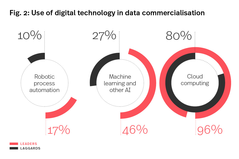 It is impossible to analyse high-volume datasets and find correlations at a sufficient velocity, without the help of advanced digital technology. Data leaders recognise this. They pour money into cloud computing and have started to scale up their adoption of other advanced digital technologies. They’re now twice as likely as laggards to have invested in robotic process automation, machine learning and other artificial intelligence technologies (Fig. 2). As data assets become increasingly large and unstructured, this trend will only accelerate.