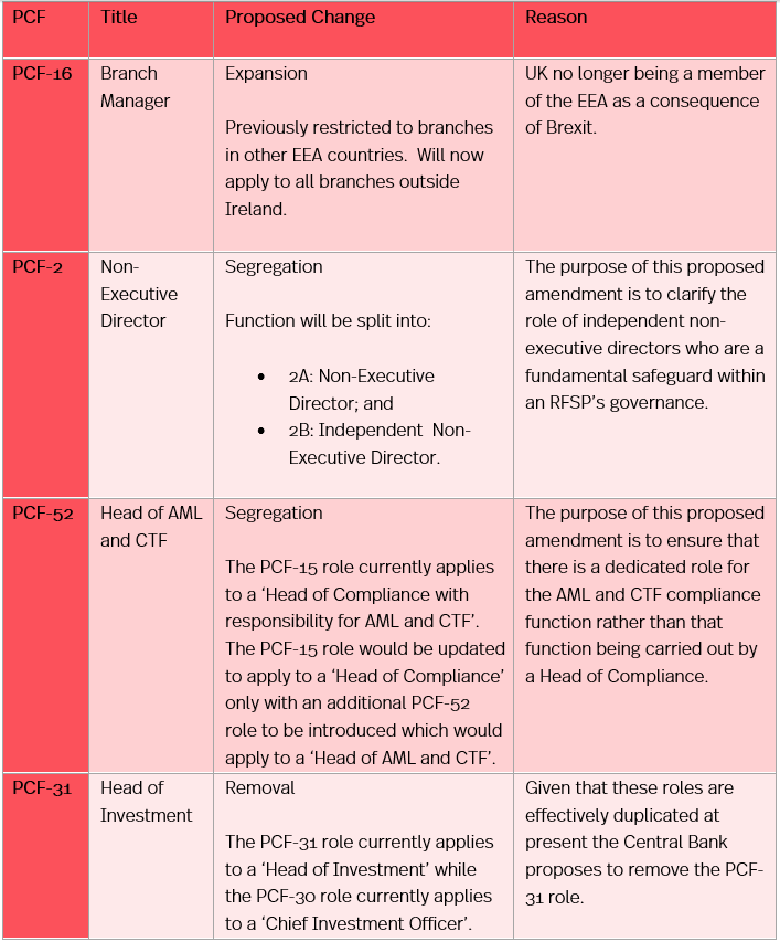 The Central Bank of Ireland (the Central Bank) published a notice of intention to amend the Pre-approval Controlled Functions (PCF) list by making the following changes:
