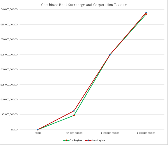 The prospect of the bank surcharge of 8% applying on top of the of the 6% increase in the main corporation tax rate was never likely to be realised given the cumulative tax rate of 33% would be internationally uncompetitive. The Treasury has opted to decrease the surcharge from 8% to 3% and increased the threshold for the bank surcharge to apply from £25m to £100m to partially mitigate these measures. The overall tax due will however universally be higher under the new measures. This is because the initial £25m will be subject to the increase in the main corporation tax rate whilst it was not subject to the bank surcharge. The marginal rate of tax under the old measures would have been higher on profits between £25m and £100m but this does not equal the additional tax due on the first £25m of profit until profit reaches £100m. The new 28% marginal rate of tax will then apply compared to the previous 27% marginal rate of tax, widening the gap between the two regimes.