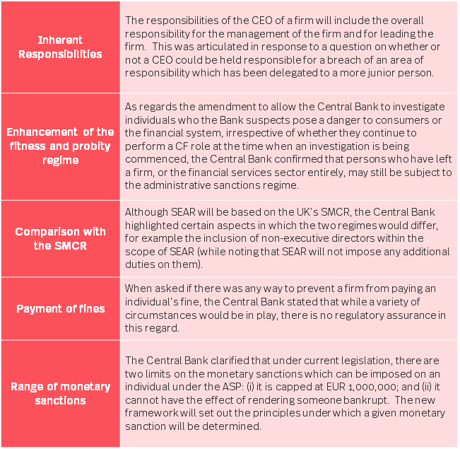 On 3 November 2021, the Joint Committee on Finance, Public Expenditure and Reform debated the general scheme of the Central Bank (Individual Accountability Framework ) Bill 2021 as part of the pre-legislative scrutiny process. The session consisted of a presentation on the individual accountability framework by the Central Bank, followed by a series of questions from the committee members, which included the following topics: