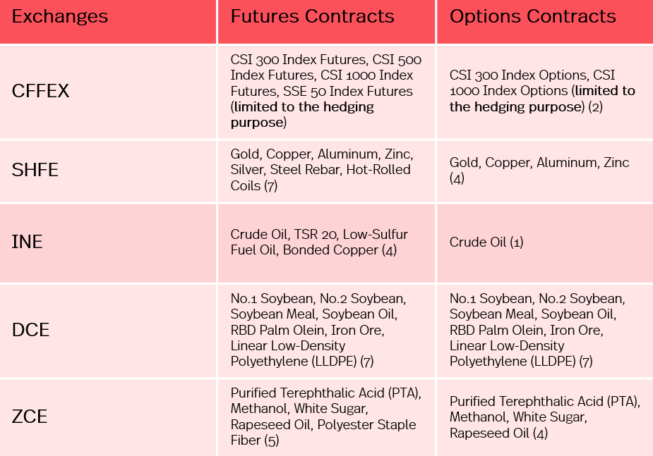 Before the implementation of the new QFI rules , overseas entities and individual investors meeting certain eligibility criteria were permitted to trade seven types of commodity futures contracts through the internationalised futures regime, as well as trade stock index futures for hedging purpose under the QFI scheme. Now under the updated QFI policies, 23 commodity futures contracts, 16 commodity options and two index options contracts are now made available for QFIs, which are set out as follows: