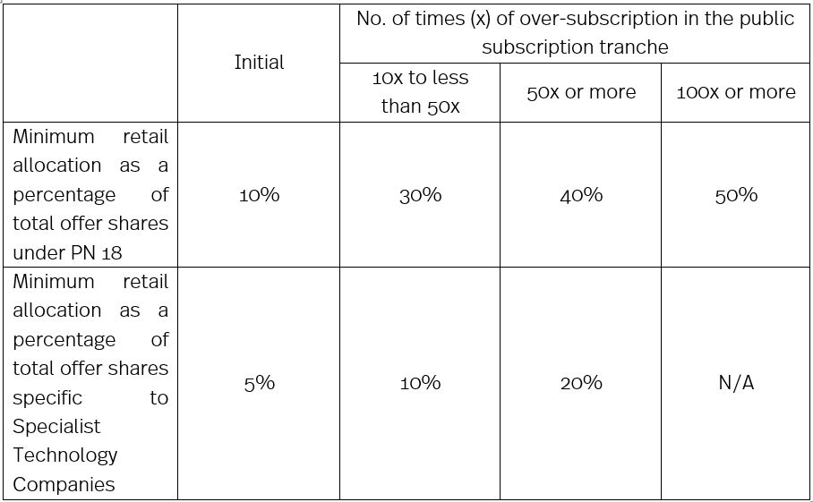 The table below shows the comparison between the initial allocation and clawback mechanism under Practice Note 18 (PN 18) and the proposed initial allocation and clawback mechanism specific to Specialist Technology Companies:
