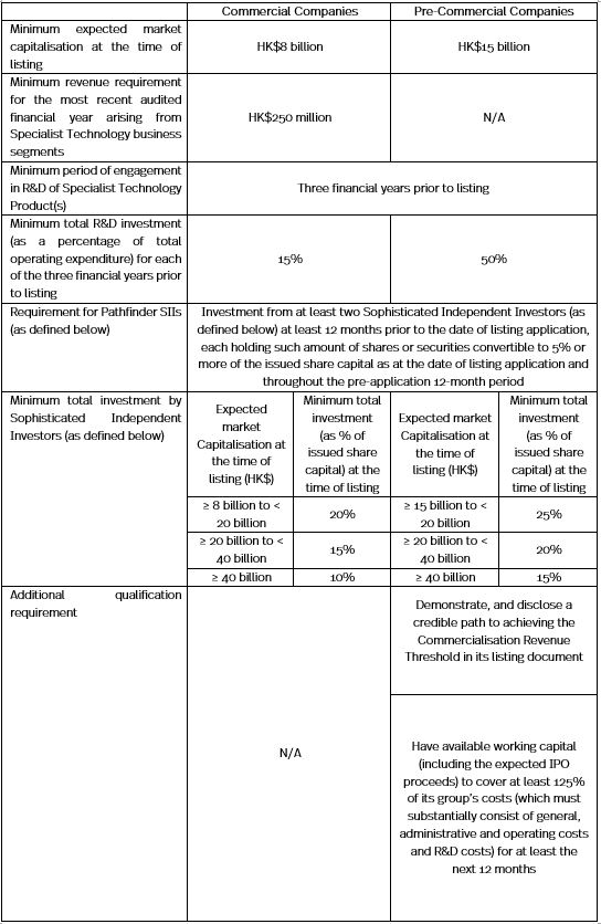 The table below summarises the proposed qualifications for listing applicable to Commercial Companies and Pre-Commercial Companies respectively: