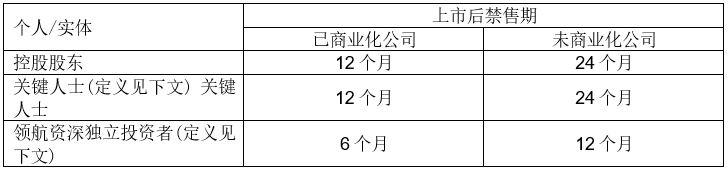 港交所以已商业化公司和未商业化公司区分适用于不同个人或实体及其紧密联系人(如适用)的首次公开招股后禁售期的期限,而未商业化公司面对更严格的要求,如下表所示。