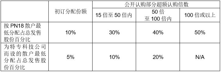 鉴于在特专科技公司估值上的固有困难,港交所建议特专科技公司必须确保在首次公开招股(IPO)中发售的股份总数(不包括因行使任何超额配股权而发行的任何股份)中,至少有50%必须由参与上市配售的独立机构投资者认购,不包括特专科技公司的现有股东及任何其紧密联系人和核心关连人士,以及符合《证券及期货条例》(第571章)附表1第1部第1节中"专业投资者"的定义,以确保一个稳健的市场定价流程。