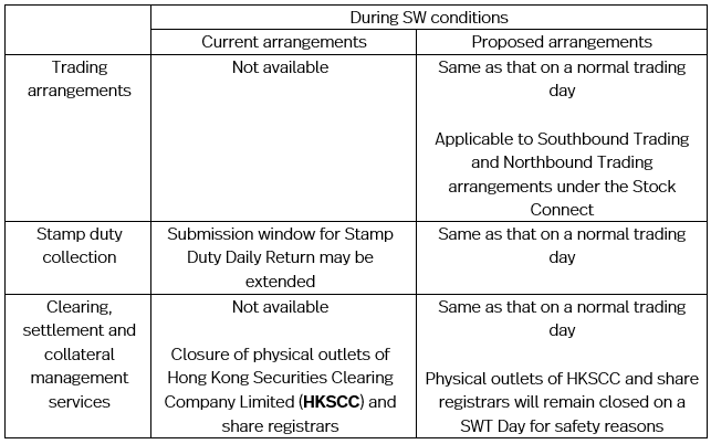 SW conditions causing market closures has been a special feature of Hong Kong for decades. The proposed changes to the existing SWT measures (except for arrangements offered by OTC Clearing Hong Kong Limited) are made in response to the 2023 Policy Address by the Chief Executive to address the issue of forced market closures under SW conditions.
