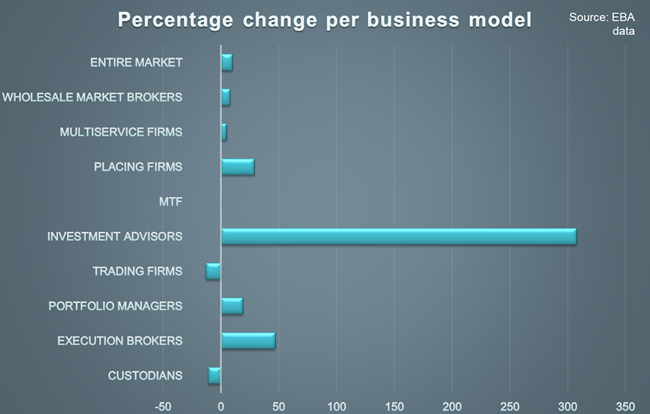 The data shows a general increase in Pillar 1 capital requirements, with a particular impact being felt by investment advisers and execution brokers. The European Commission state that the large increase for advisory firms is because: