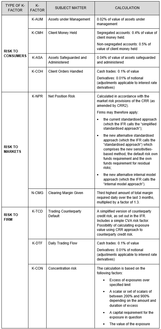 A K-factor requirement – based on “K-factors” which are proxies or metrics for measuring the different types of risk to which a firm is exposed.